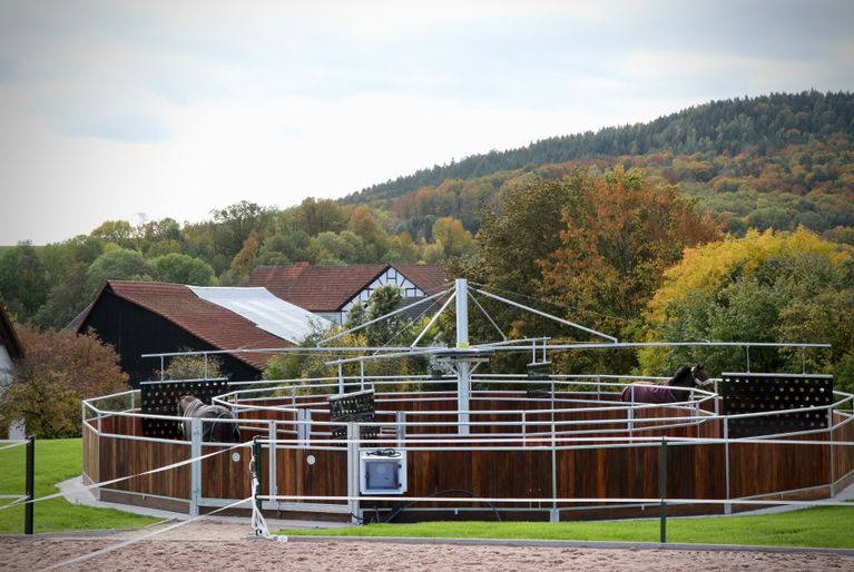 Durch unsere neue Führmaschine können wir sicherstellen, dass unsere Pferde zusätzlich die Möglichkeit haben ein weiteres Mal bewegt zu werden und aufgewärmt auf die Koppel und ins Training starten